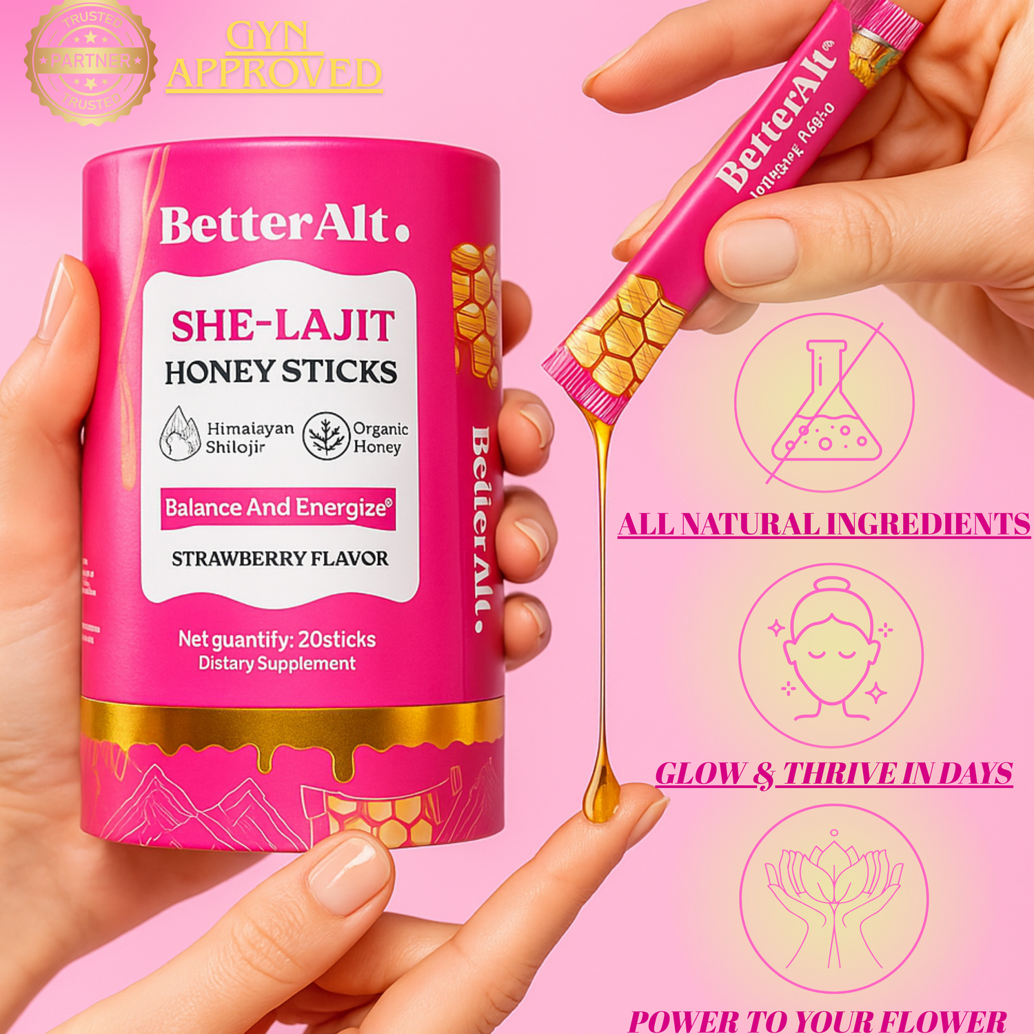 She-Lajit Honey Sticks are a natural blend of Himalayan Shilajit and organic honey, designed to restore your energy, boost confidence, and reignite intimacy—helping you feel vibrant, sexy, and connected again